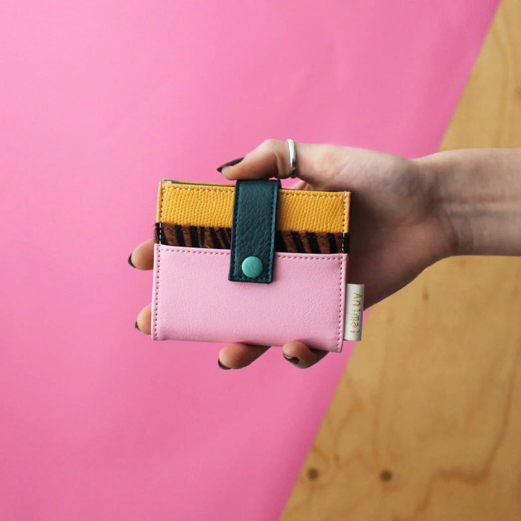 Features: A gorgeous Wallet for all the Animal print fans out there including a Dalmatian fur flap which is poppered in a contrasting Coral to reveal plenty of card slots. Also included a Gold metal zip at the top for your cash