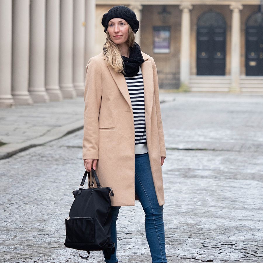 Black nylon backpack with adjustable length shoulder straps, additional carry straps and lined interior