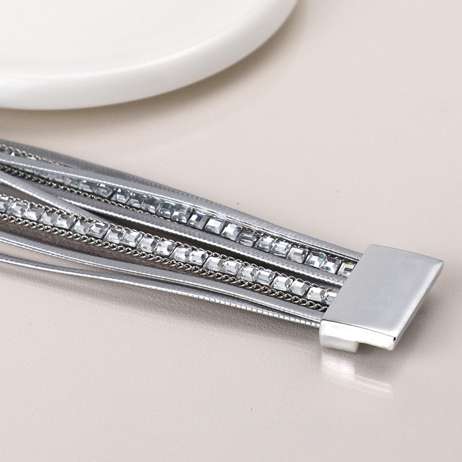 Multistrand metallic grey leather magnetic bracelet with square glass crystals and silver plated beads