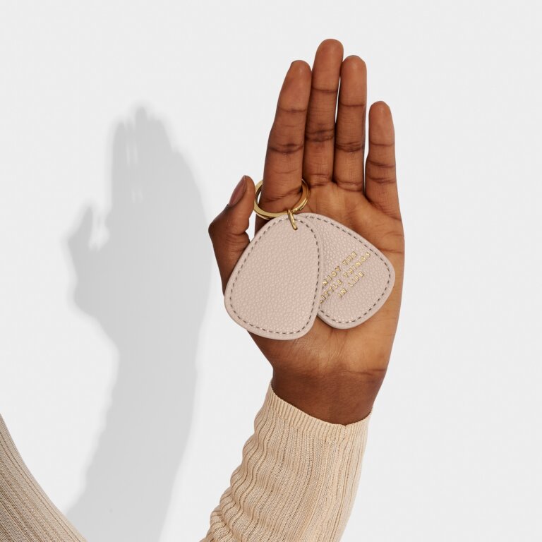 Surprise a loved one (or treat yourself!) in the most thoughtful way with our Beautifully Boxed Keyring in taupe. Designed with our signature vegan leather material, and a soft pebble design which has been engraved with the adorable message 'Enjoy The Little Things In Life'. Complete with chic white packaging and stamped golden logo, they are sure to fall in love with this little luxury.