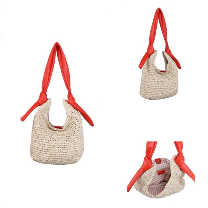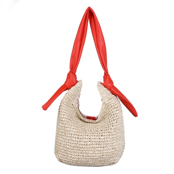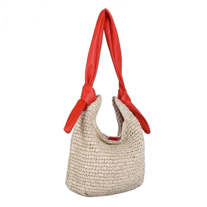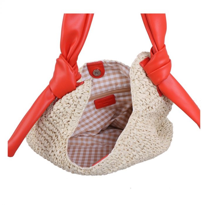 Cream Woven Shoulder Bag, with a soft to touch PU strap in Coral.